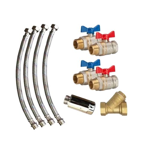 - دو عدد شیر ربع گرد ۱/۲ اینچ: شیرآلات استاندارد برای قطع و وصل کردن جریان آب ورودی و خروجی پکیج.